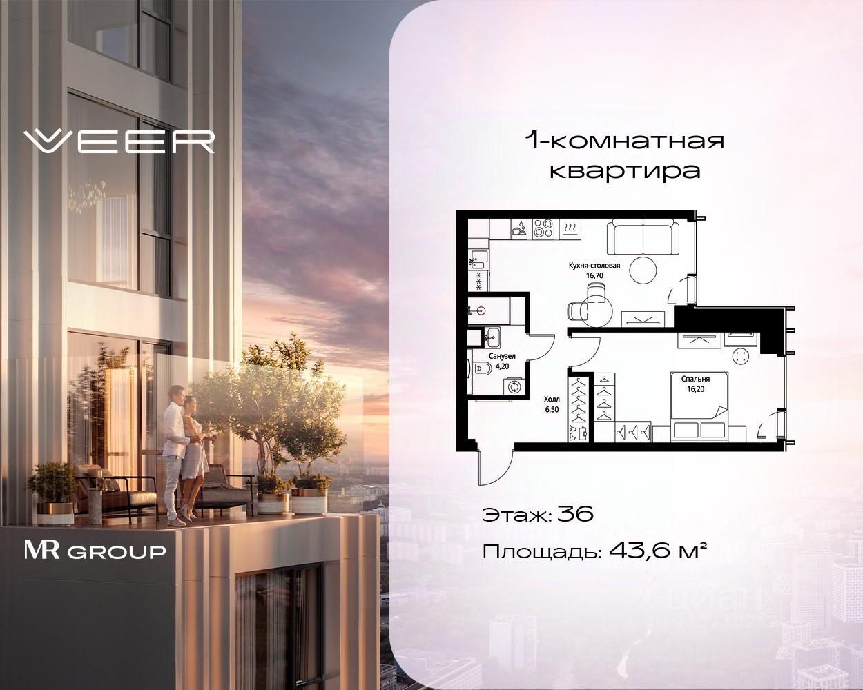 Продаётся 1-комнатная квартира общей площадью 43.60 м² с предчистовой отделкой в ЖК VEER на 36-м этаже 59 этажного дома.
