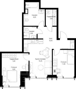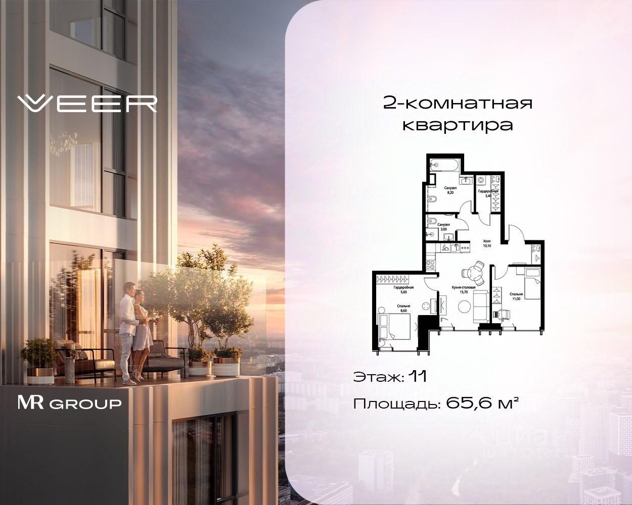 Продаётся 2-комнатная квартира общей площадью 65.60 м² с предчистовой отделкой в ЖК VEER на 11-м этаже 59 этажного дома.