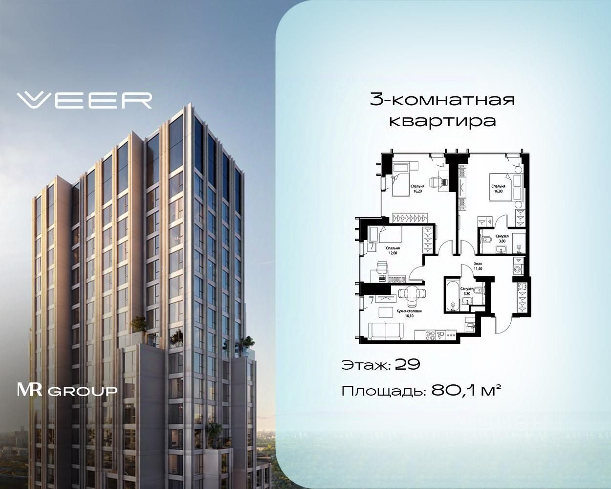 Продаётся 3-комнатная квартира общей площадью 80.10 м² с предчистовой отделкой в ЖК VEER на 29-м этаже 59 этажного дома.