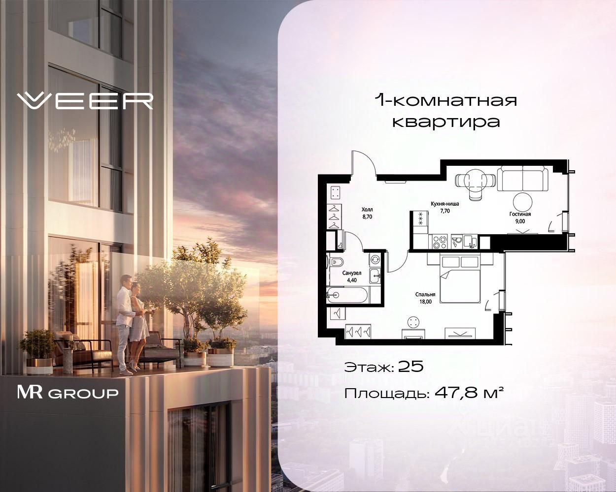 Продаётся 1-комнатная квартира общей площадью 47.80 м² с предчистовой отделкой в ЖК VEER на 25-м этаже 59 этажного дома.