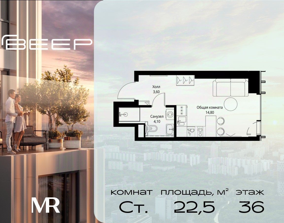 Продаётся студия общей площадью 22.50 м² с предчистовой отделкой в ЖК Веер на 36-м этаже 59 этажного дома.