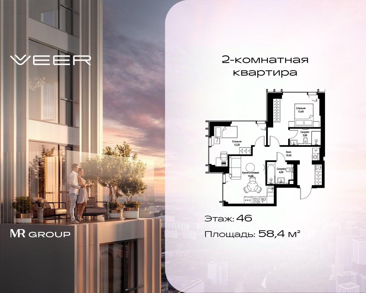 Продаётся 2-комнатная квартира общей площадью 58.40 м² с предчистовой отделкой в ЖК VEER на 46-м этаже 59 этажного дома.