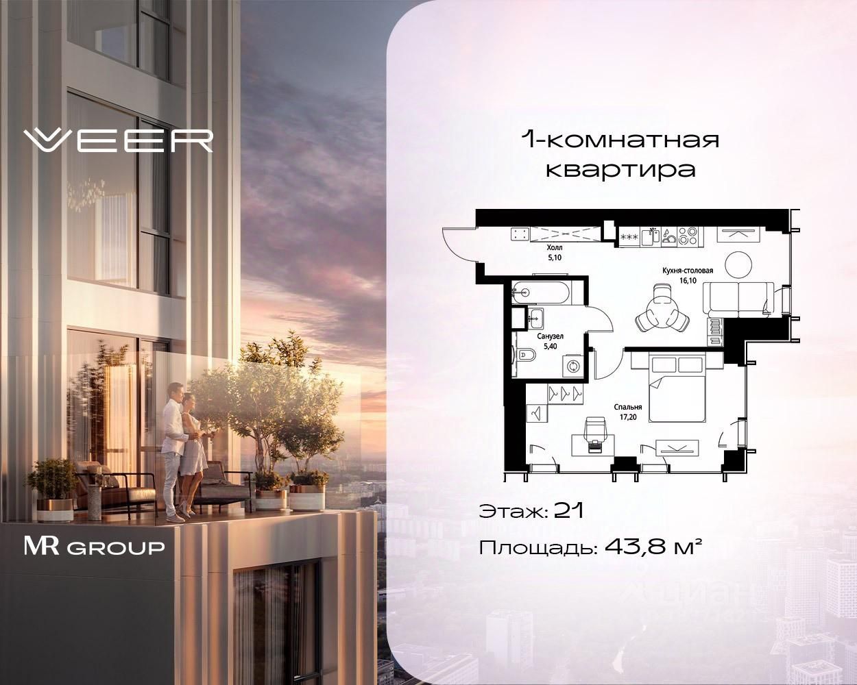 Продаётся 1-комнатная квартира общей площадью 43.80 м² с предчистовой отделкой в ЖК VEER на 21-м этаже 59 этажного дома.