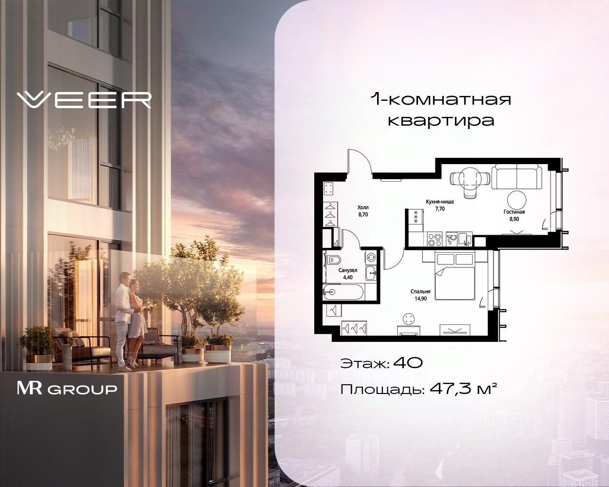 Продаётся 1-комнатная квартира общей площадью 47.30 м² с предчистовой отделкой в ЖК VEER на 40-м этаже 59 этажного дома.