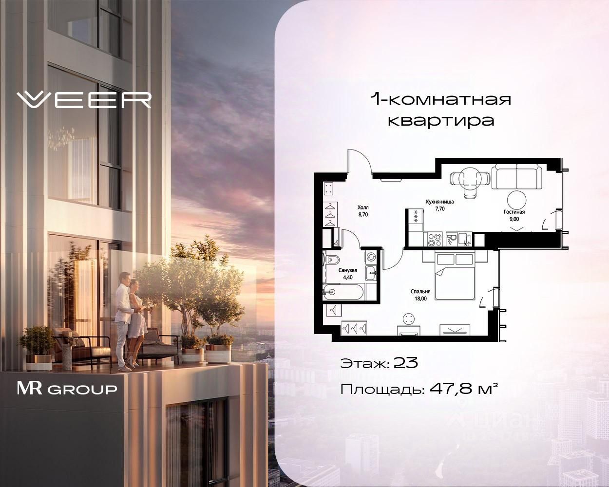 Продаётся 1-комнатная квартира общей площадью 47.80 м² с предчистовой отделкой в ЖК VEER на 23-м этаже 59 этажного дома.