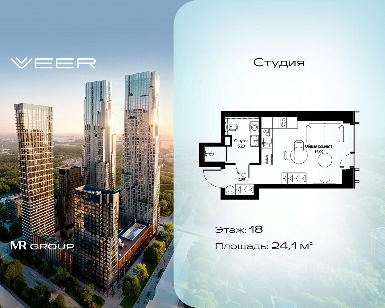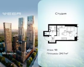 Продаётся студия общей площадью 24.10 м² с предчистовой отделкой в ЖК VEER на 18-м этаже 59 этажного дома.