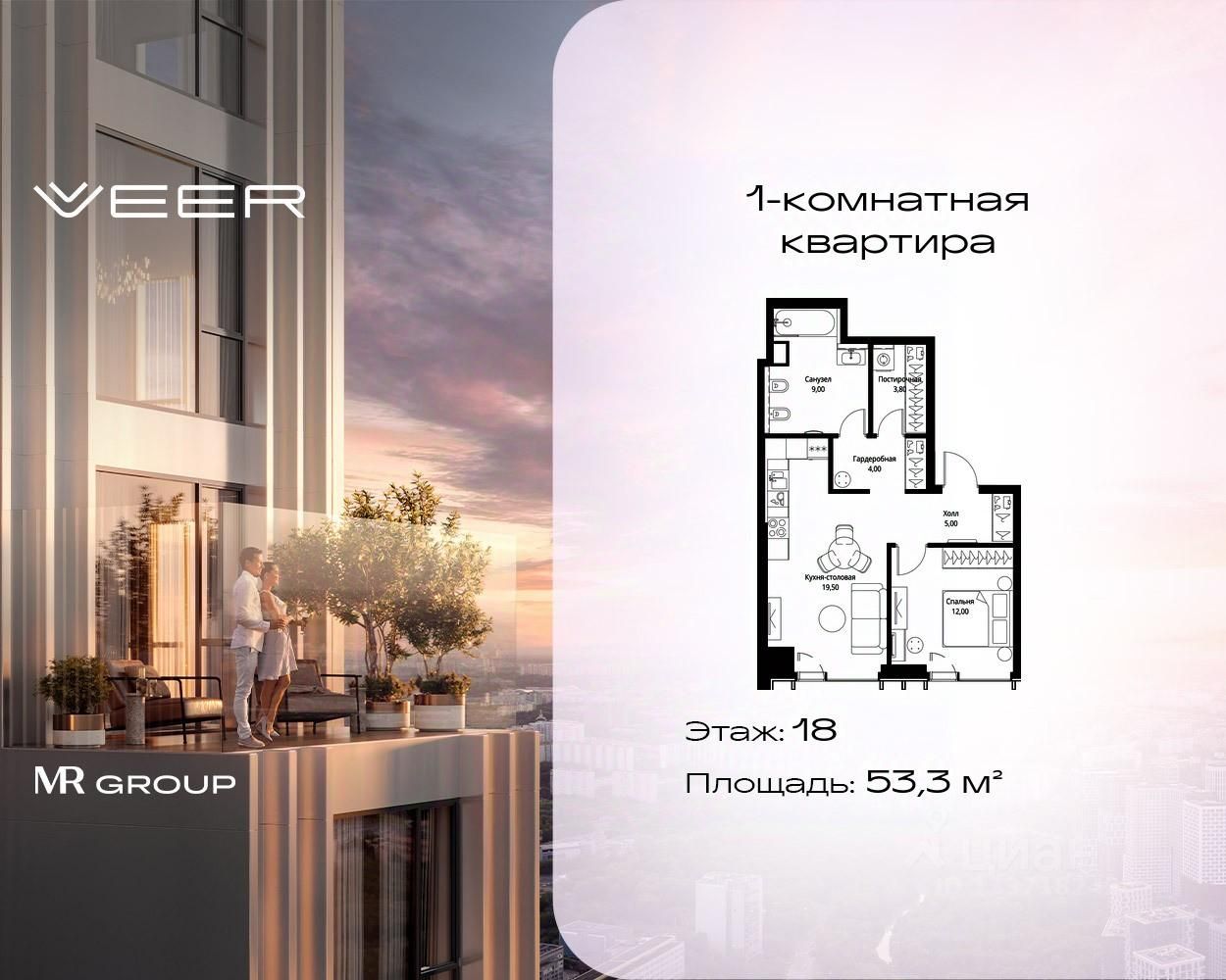 Продаётся 1-комнатная квартира общей площадью 53.30 м² с предчистовой отделкой в ЖК VEER на 18-м этаже 59 этажного дома.