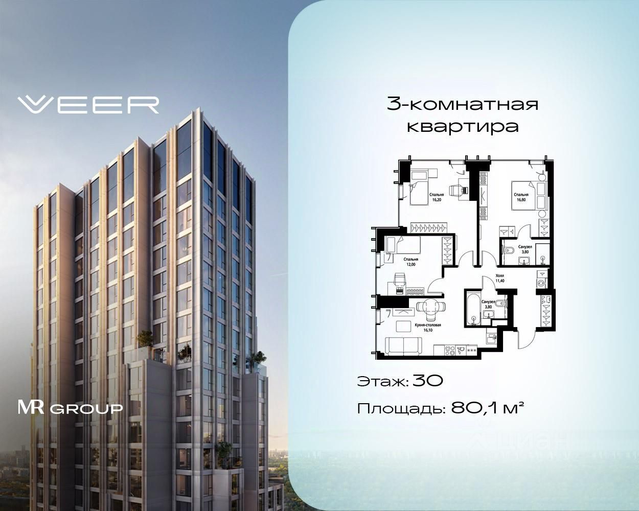 Продаётся 3-комнатная квартира общей площадью 80.10 м² с предчистовой отделкой в ЖК VEER на 30-м этаже 59 этажного дома.