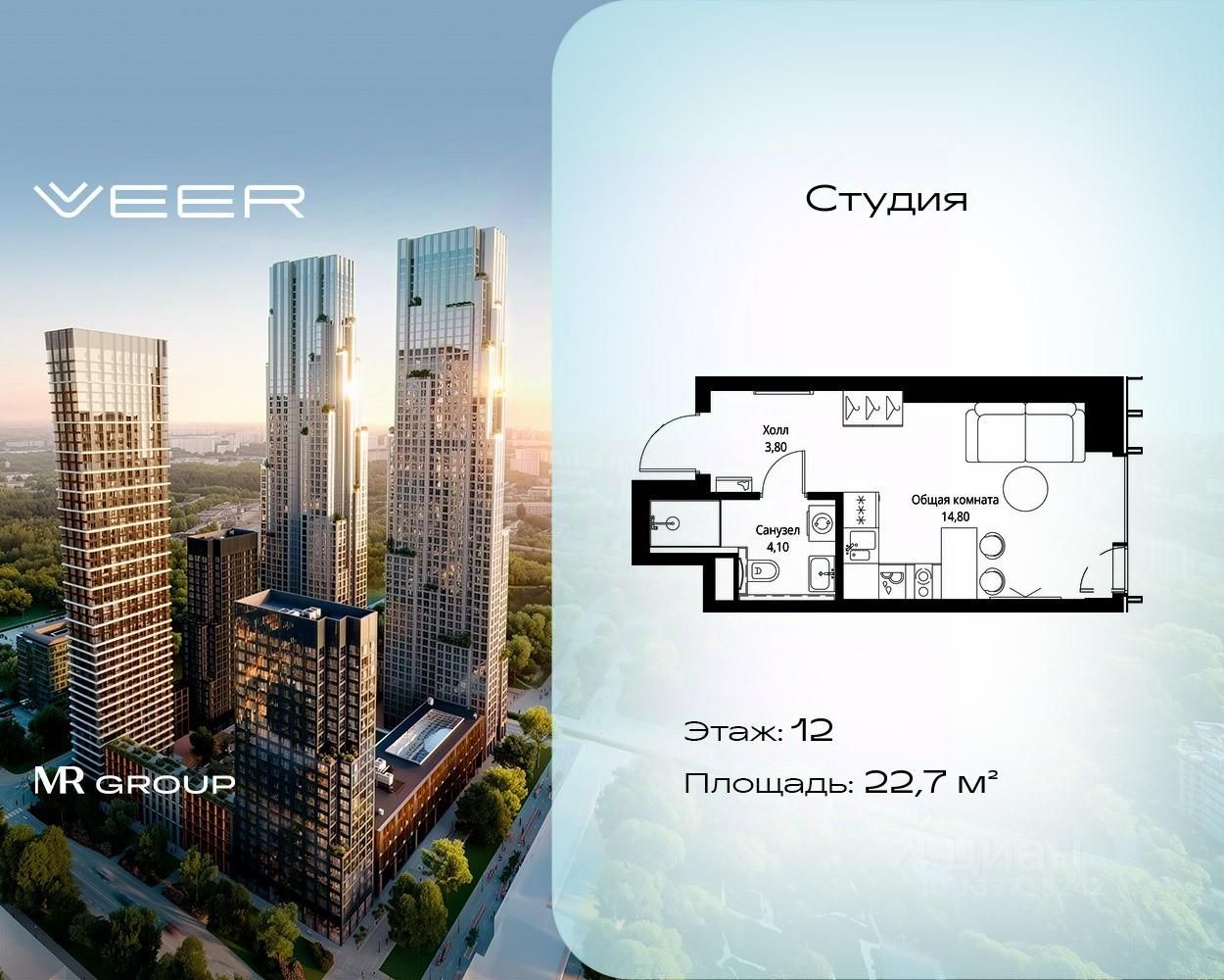 Продаётся студия общей площадью 22.70 м² с предчистовой отделкой в ЖК VEER на 12-м этаже 59 этажного дома.