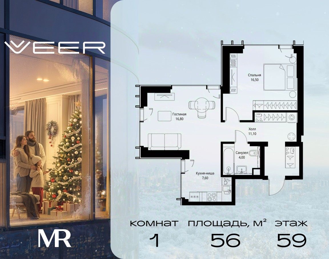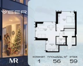 Продаётся 1-комнатная квартира общей площадью 56 м² с предчистовой отделкой в ЖК VEER на 59-м этаже 59 этажного дома.