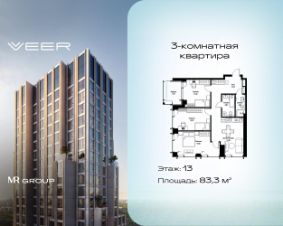 Продаётся 3-комнатная квартира общей площадью 83.30 м² с предчистовой отделкой в ЖК VEER на 13-м этаже 59 этажного дома.