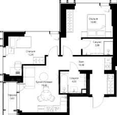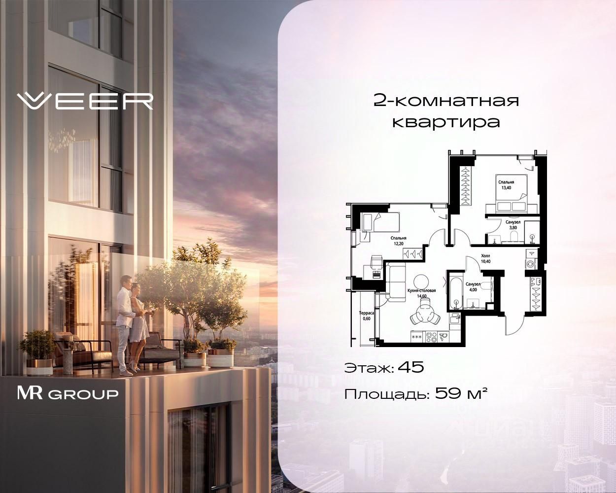 Продаётся 2-комнатная квартира общей площадью 59 м² с предчистовой отделкой в ЖК VEER на 45-м этаже 59 этажного дома.