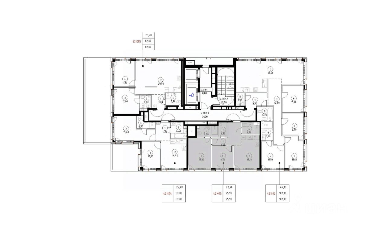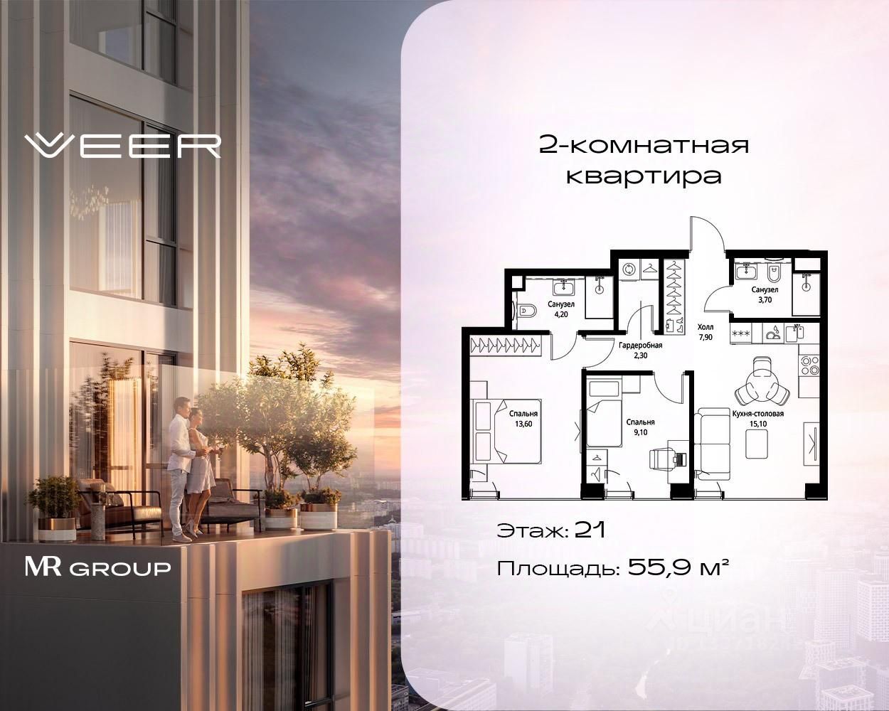 Продаётся 2-комнатная квартира общей площадью 55.90 м² с предчистовой отделкой в ЖК VEER на 21-м этаже 22 этажного дома.