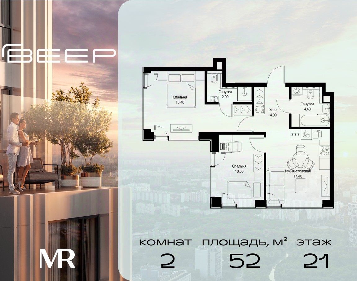 Продаётся 2-комнатная квартира общей площадью 52 м² с предчистовой отделкой в ЖК Веер на 21-м этаже 22 этажного дома.