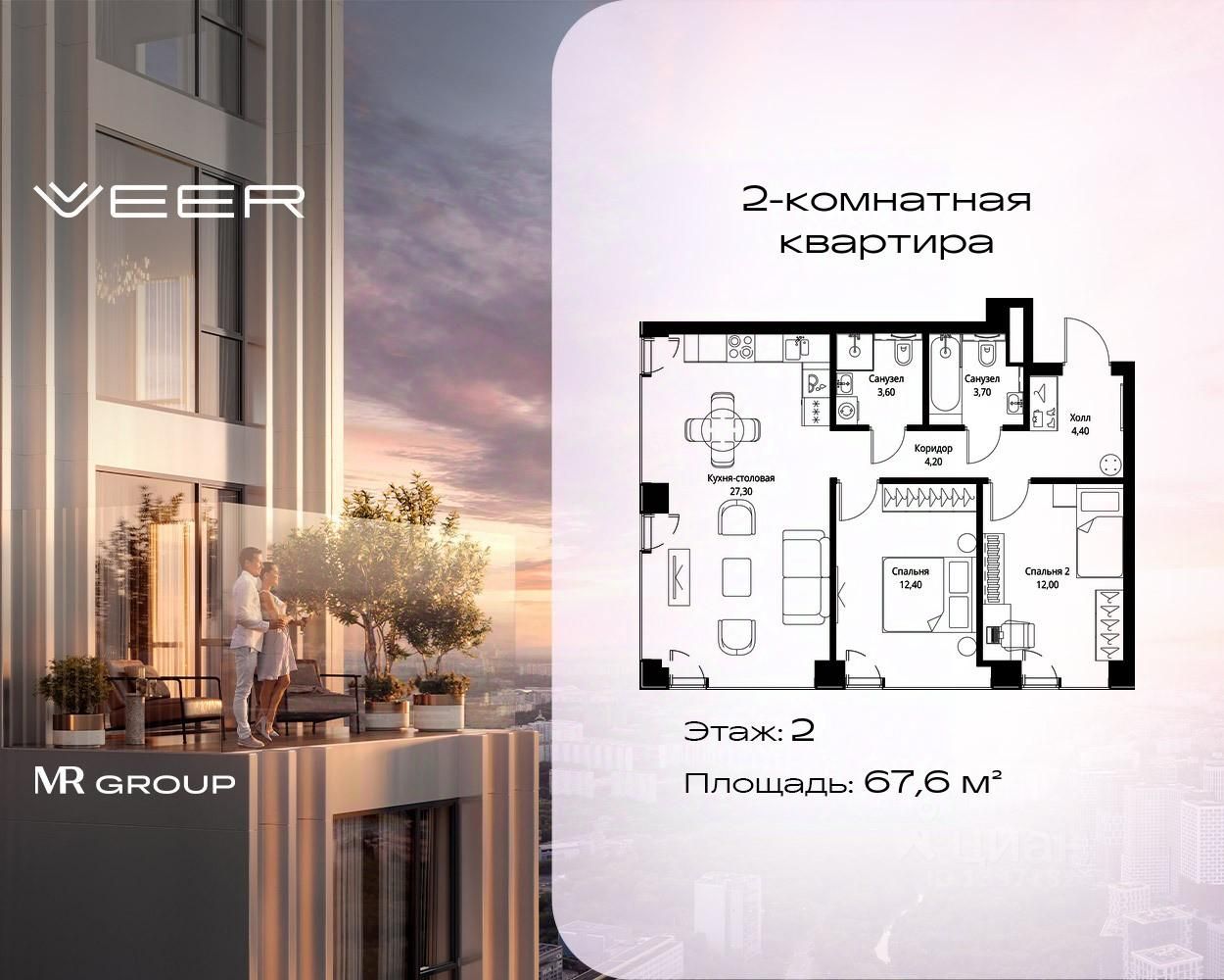 Продаётся 2-комнатная квартира общей площадью 67.60 м² с предчистовой отделкой в ЖК VEER на 2-м этаже 22 этажного дома.