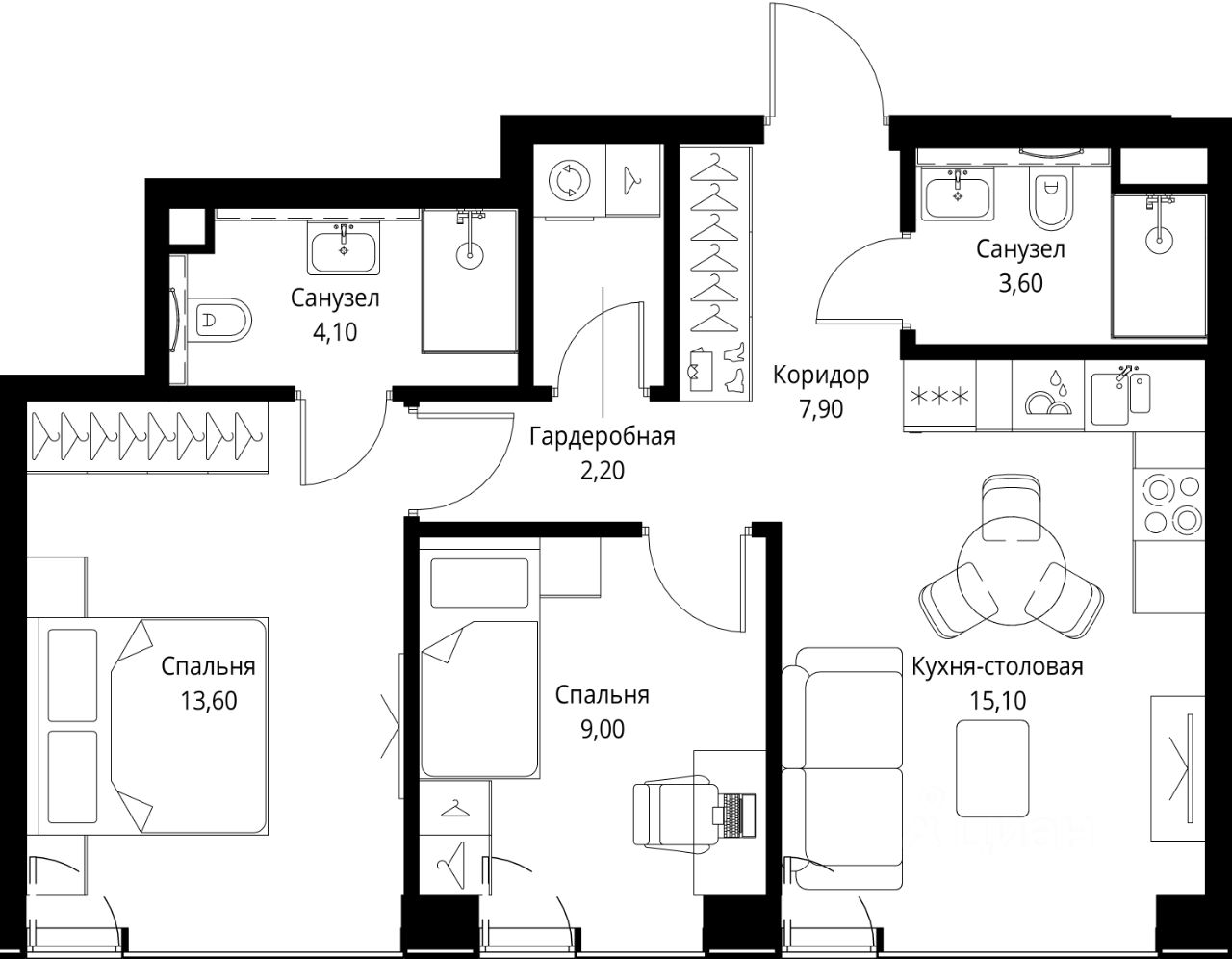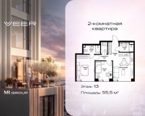 Продаётся 2-комнатная квартира общей площадью 55.50 м² с предчистовой отделкой в ЖК VEER на 13-м этаже 22 этажного дома.