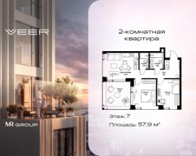 Продаётся 2-комнатная квартира общей площадью 57.90 м² с предчистовой отделкой в ЖК VEER на 7-м этаже 22 этажного дома.