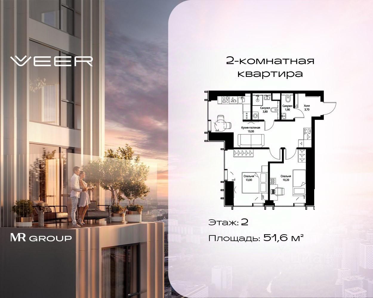 Продаётся 2-комнатная квартира общей площадью 51.60 м² без отделки в ЖК VEER на 2-м этаже 59 этажного дома.