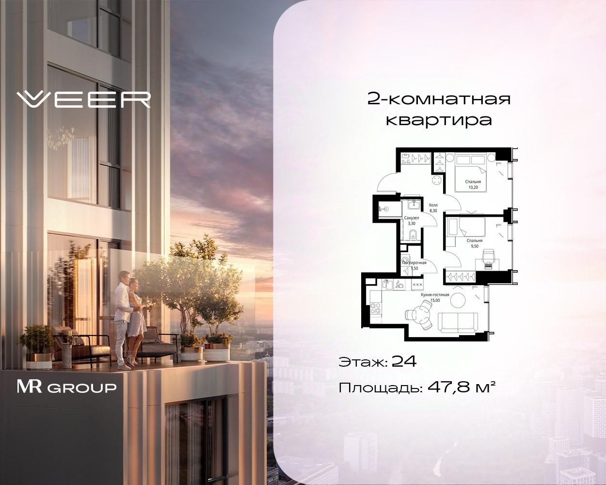 Продаётся 2-комнатная квартира общей площадью 47.80 м² без отделки в ЖК VEER на 24-м этаже 59 этажного дома.