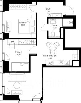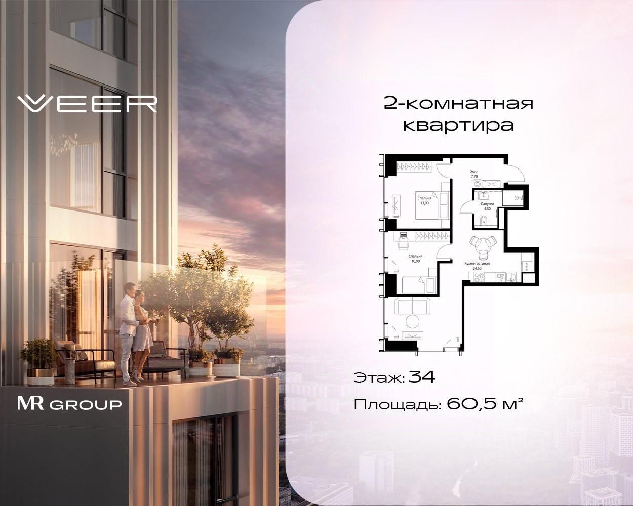 Продаётся 2-комнатная квартира общей площадью 60.50 м² без отделки в ЖК VEER на 34-м этаже 59 этажного дома.
