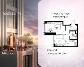 Продаётся 1-комнатная квартира общей площадью 41.60 м² без отделки в ЖК VEER на 13-м этаже 59 этажного дома.