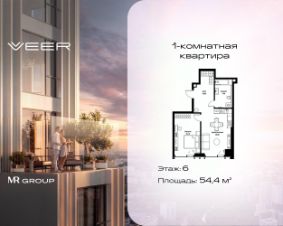 Продаётся 1-комнатная квартира общей площадью 54.40 м² без отделки в ЖК VEER на 6-м этаже 59 этажного дома.