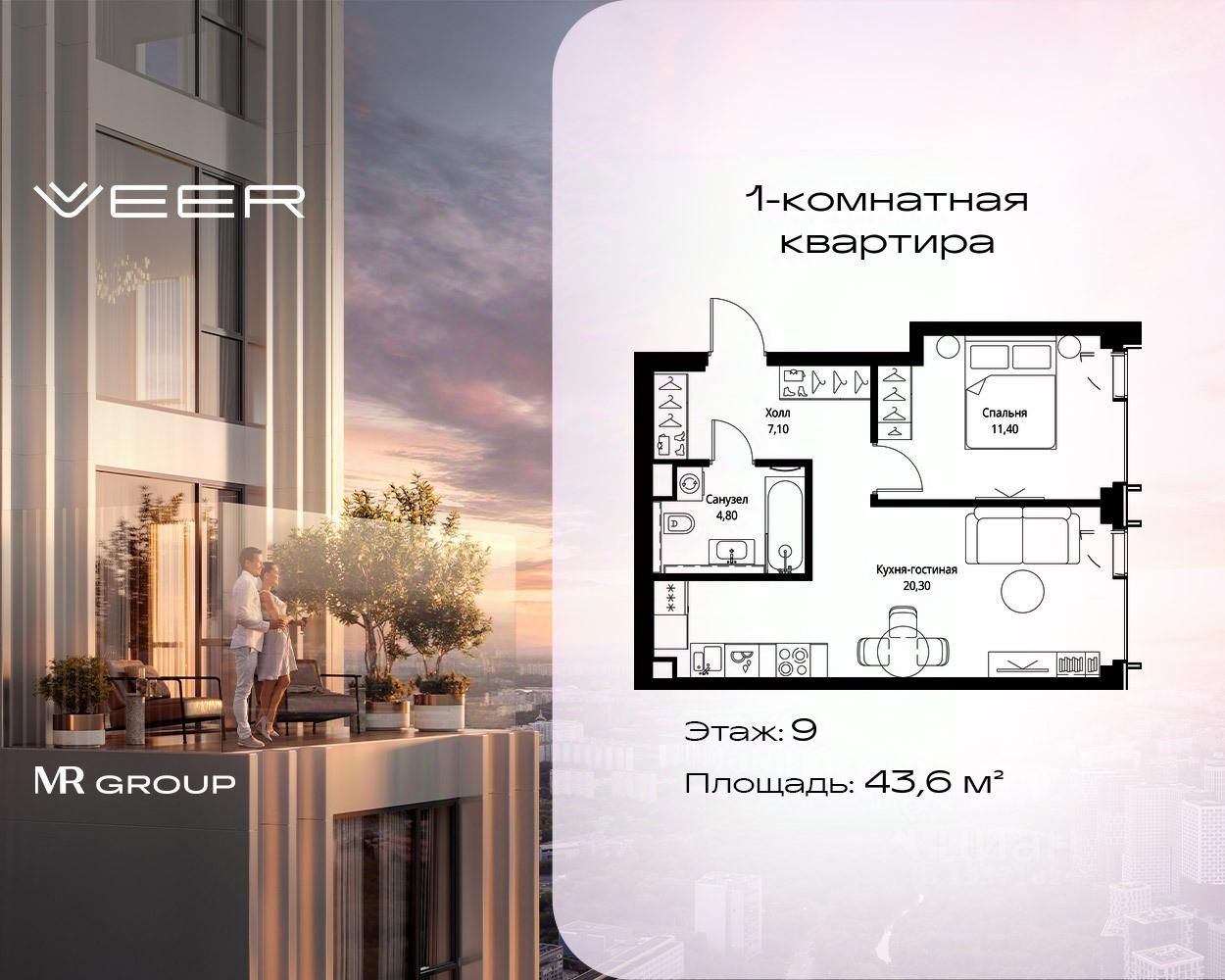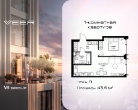 Продаётся 1-комнатная квартира общей площадью 43.60 м² без отделки в ЖК VEER на 9-м этаже 59 этажного дома.