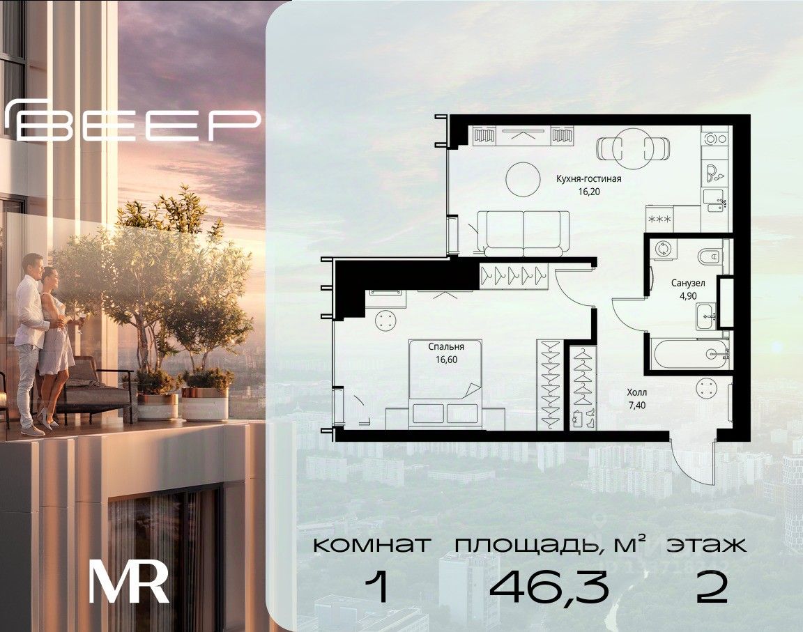 Продаётся 1-комнатная квартира общей площадью 46.30 м² без отделки в ЖК Веер на 2-м этаже 59 этажного дома.