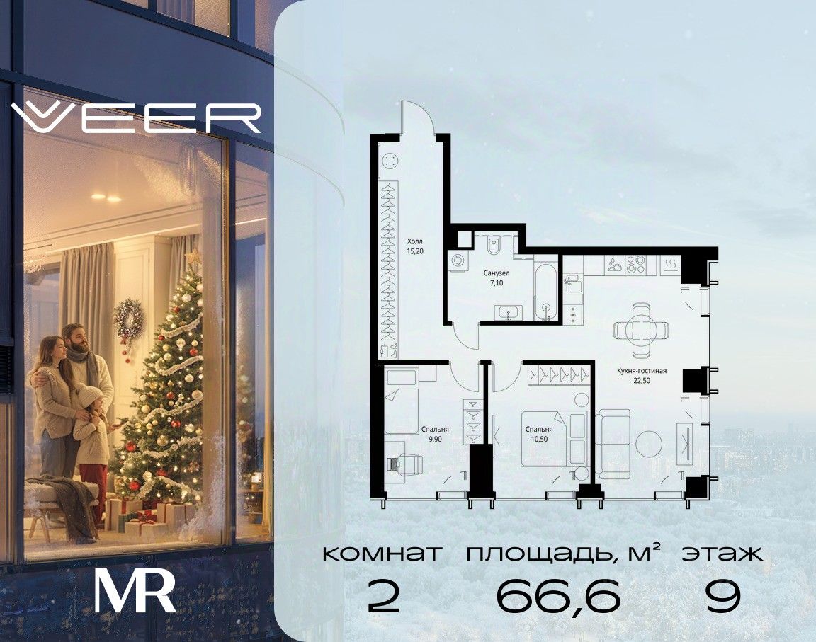 Продаётся 2-комнатная квартира общей площадью 66.60 м² без отделки в ЖК VEER на 9-м этаже 59 этажного дома.