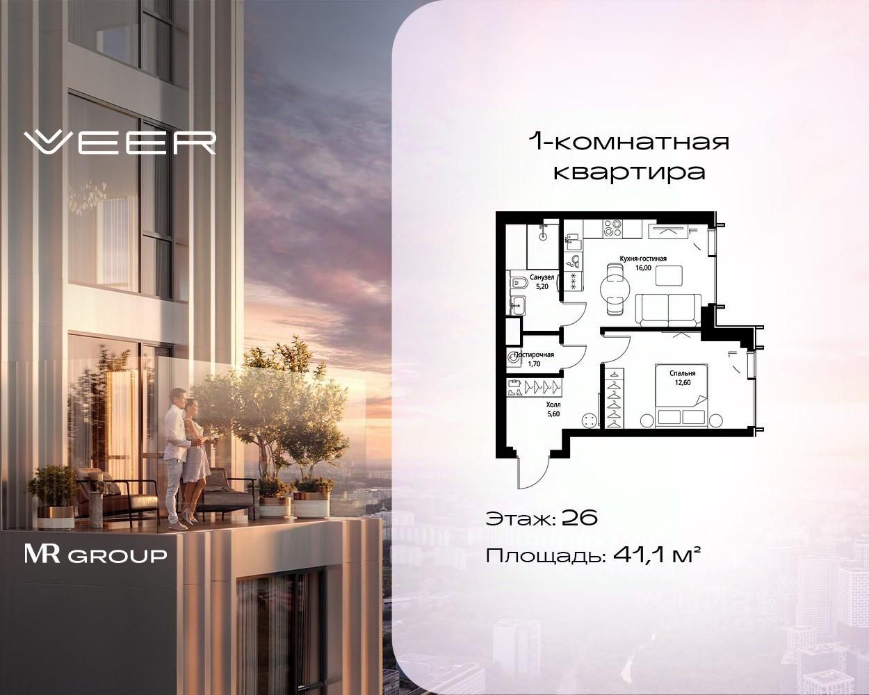 Продаётся 1-комнатная квартира общей площадью 41.10 м² без отделки в ЖК VEER на 26-м этаже 59 этажного дома.