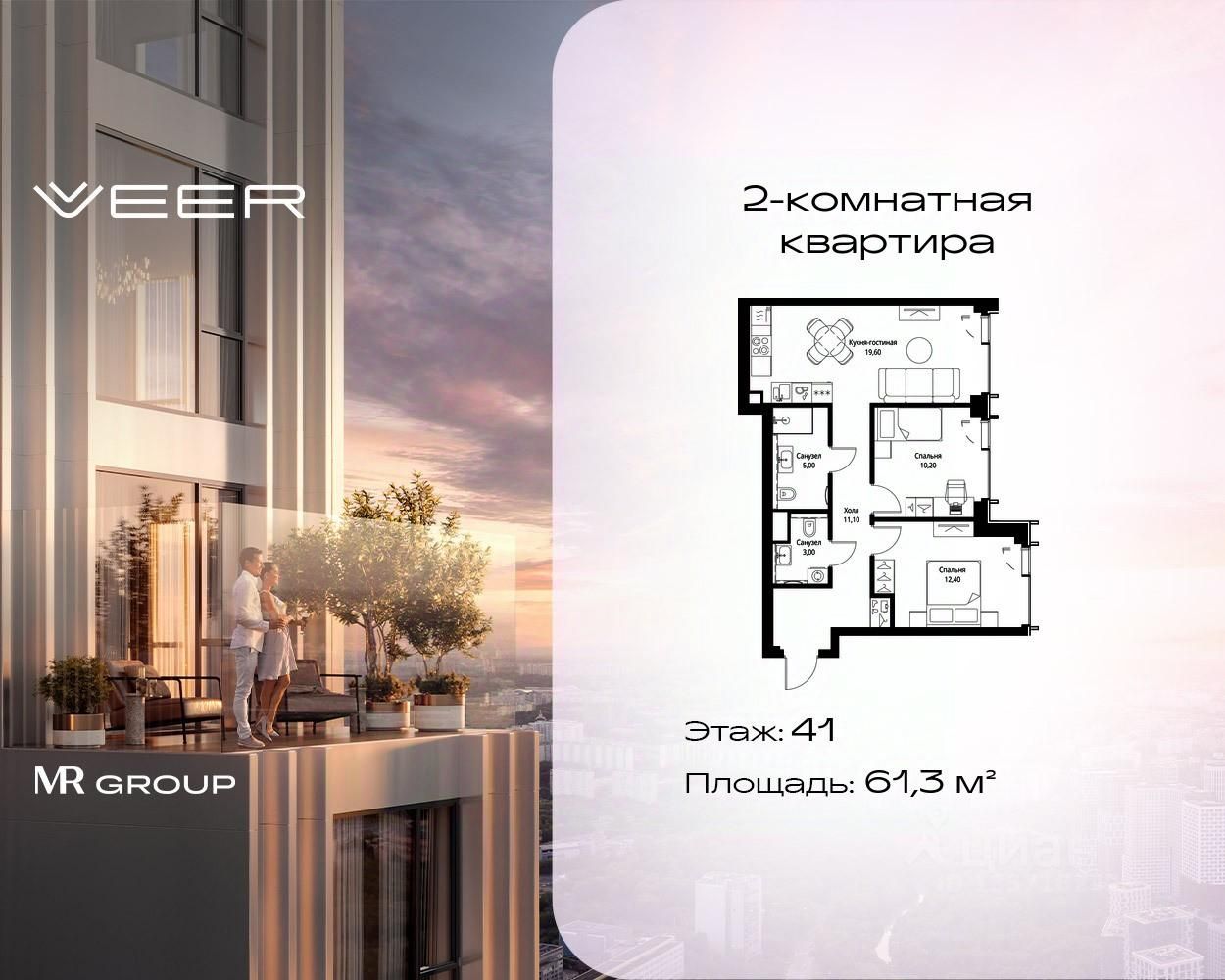 Продаётся 2-комнатная квартира общей площадью 61.30 м² без отделки в ЖК VEER на 41-м этаже 59 этажного дома.