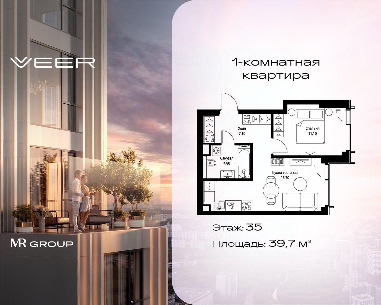 Продаётся 1-комнатная квартира общей площадью 39.70 м² без отделки в ЖК VEER на 35-м этаже 59 этажного дома.
