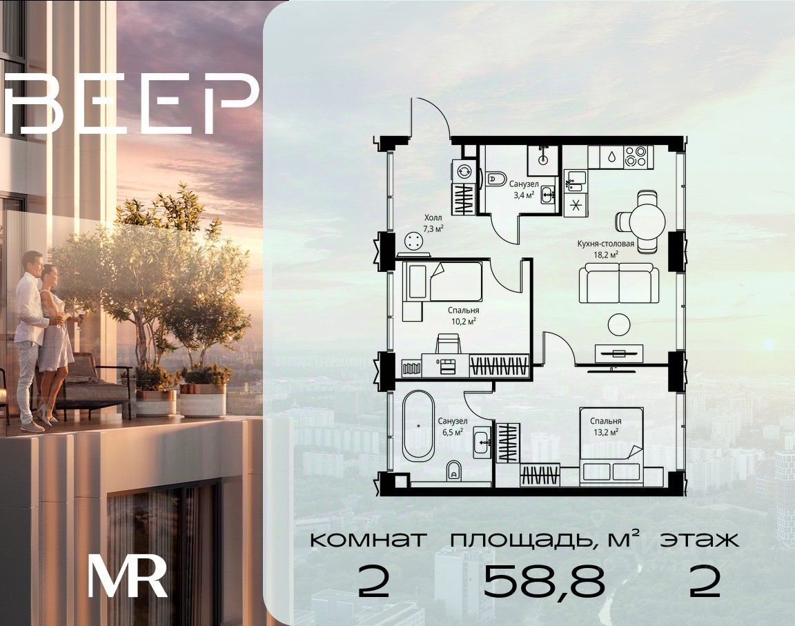 Продаётся 2-комнатная квартира общей площадью 58.80 м² без отделки в ЖК Веер на 2-м этаже 59 этажного дома.