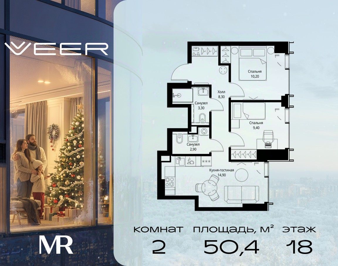 Продаётся 2-комнатная квартира общей площадью 50.40 м² без отделки в ЖК Веер на 18-м этаже 59 этажного дома.