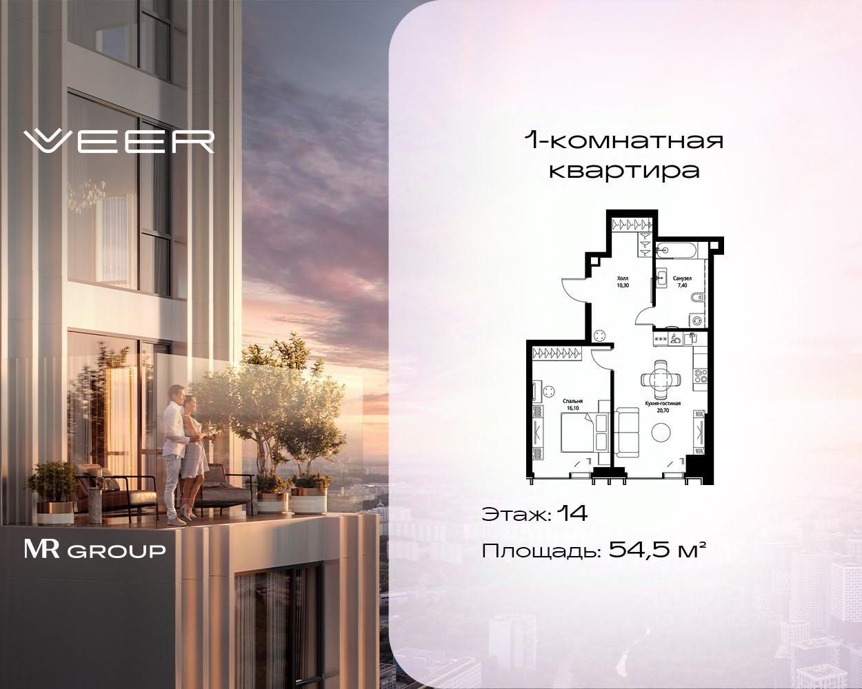 Продаётся 1-комнатная квартира общей площадью 54.50 м² без отделки в ЖК VEER на 14-м этаже 59 этажного дома.