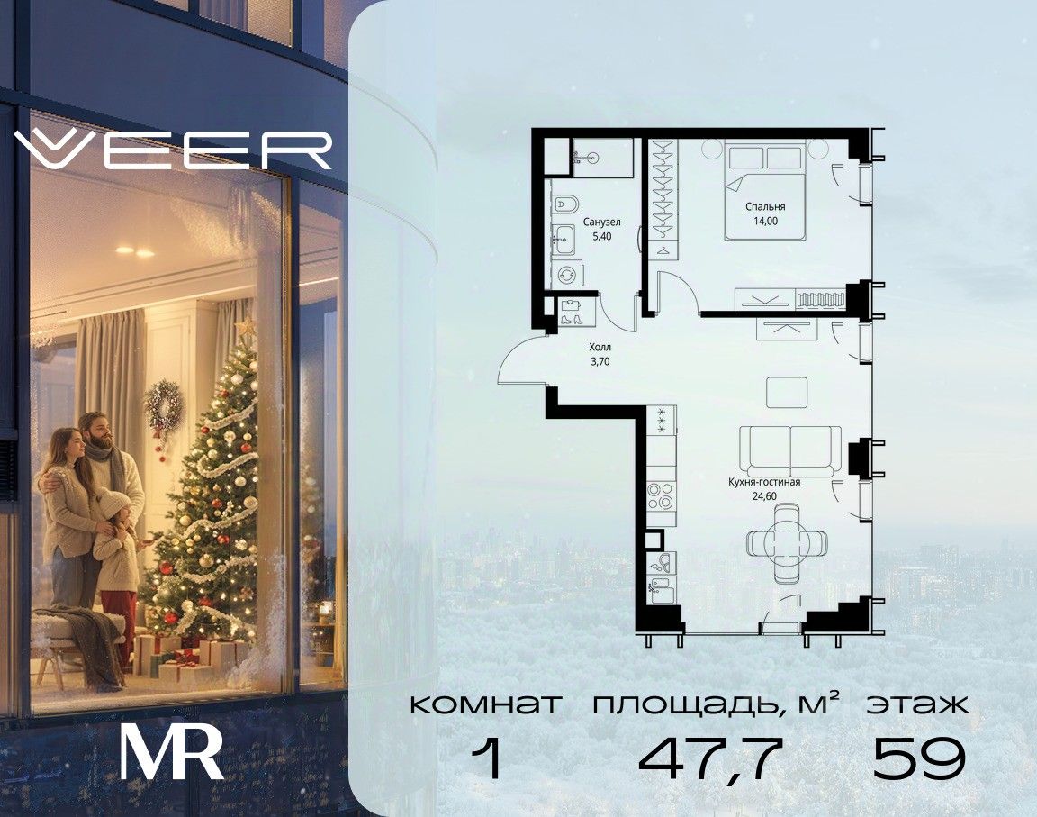 Продаётся 1-комнатная квартира общей площадью 47.70 м² без отделки в ЖК VEER на 59-м этаже 59 этажного дома.