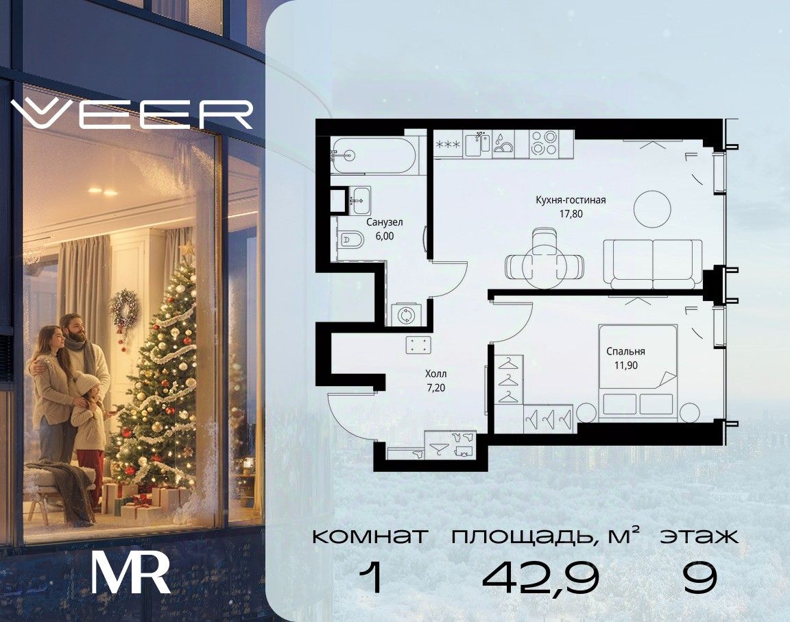 Продаётся 1-комнатная квартира общей площадью 42.90 м² без отделки в ЖК VEER на 9-м этаже 59 этажного дома.