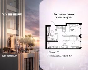 Продаётся 1-комнатная квартира общей площадью 43.60 м² без отделки в ЖК VEER на 11-м этаже 59 этажного дома.
