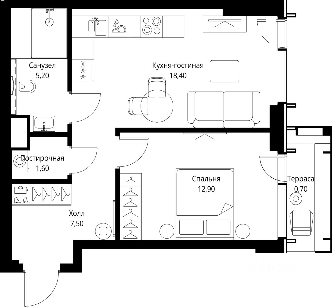 Продаётся 1-комнатная квартира общей площадью 46.30 м² без отделки в ЖК VEER на 13-м этаже 59 этажного дома.