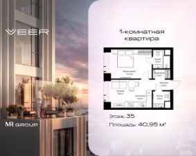 Продаётся 1-комнатная квартира общей площадью 40.95 м² без отделки в ЖК VEER на 35-м этаже 70 этажного дома.