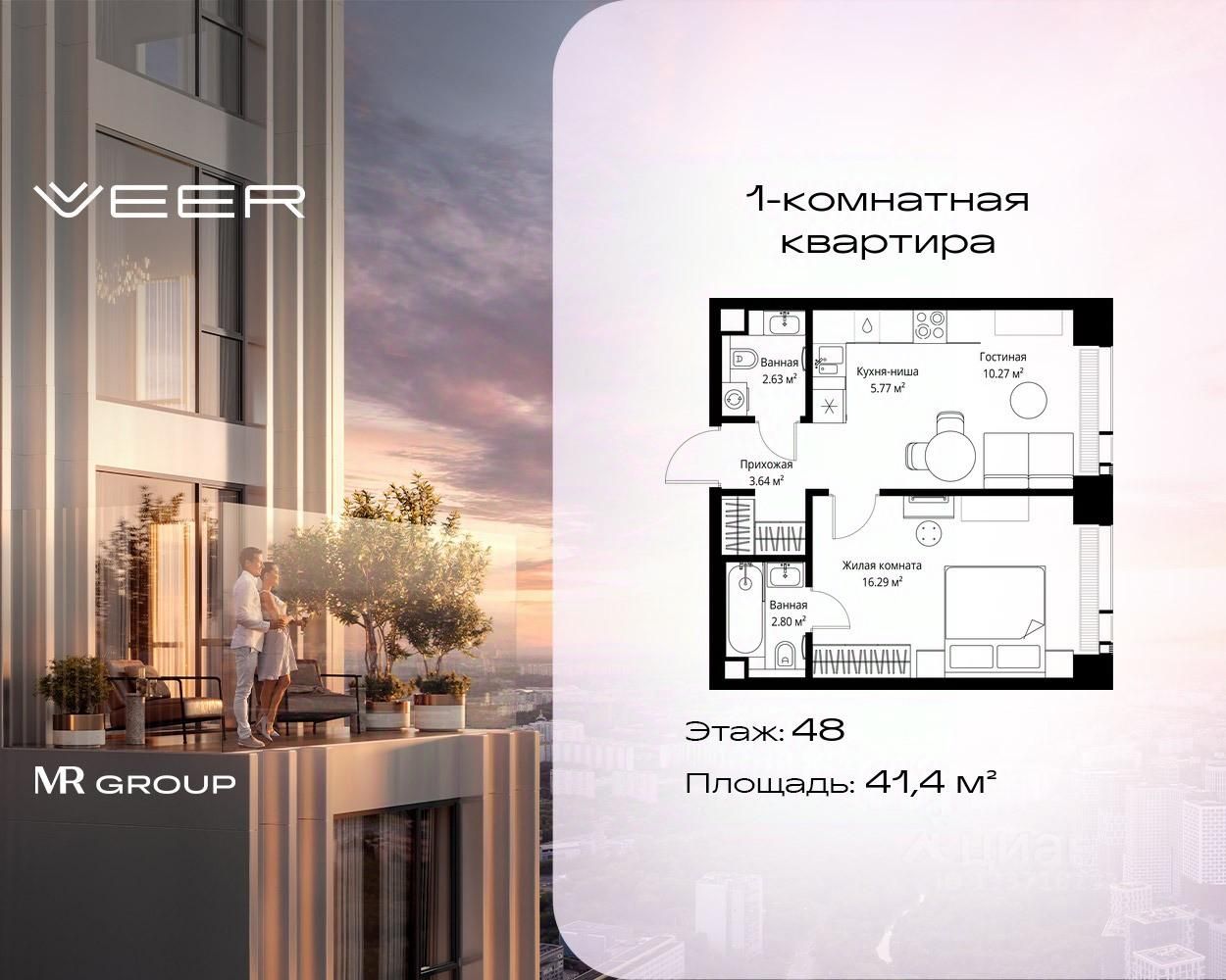 Продаётся 1-комнатная квартира общей площадью 41.40 м² без отделки в ЖК VEER на 48-м этаже 70 этажного дома.