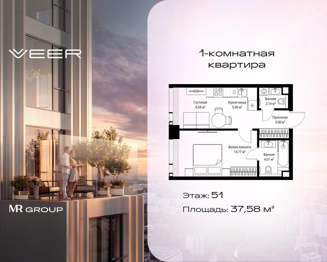 Продаётся 1-комнатная квартира общей площадью 37.58 м² без отделки в ЖК VEER на 51-м этаже 70 этажного дома.