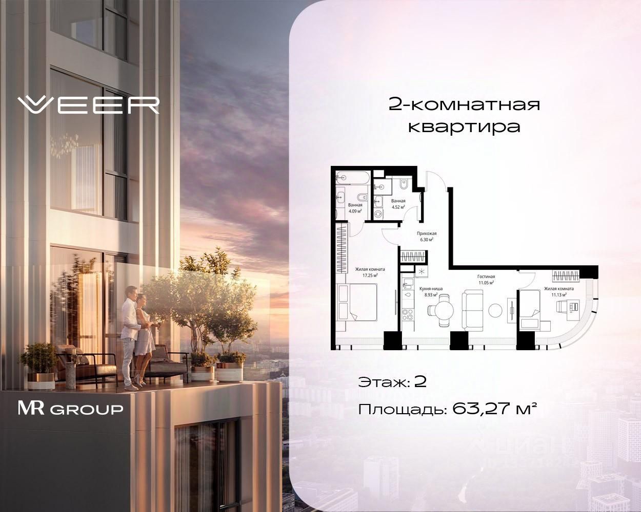 Продаётся 2-комнатная квартира общей площадью 63.27 м² без отделки в ЖК VEER на 2-м этаже 70 этажного дома.