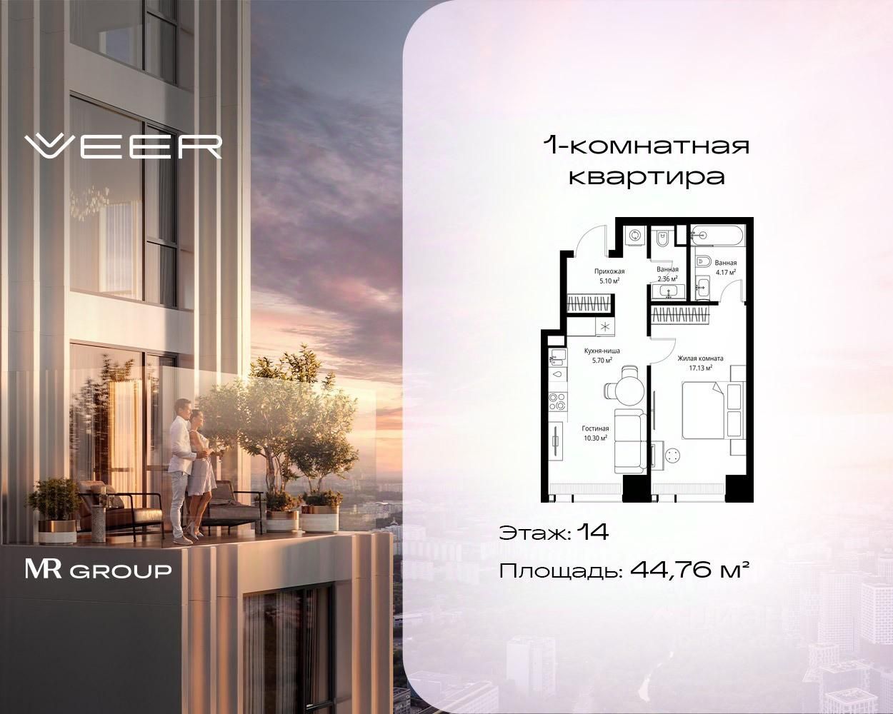 Продаётся 1-комнатная квартира общей площадью 44.76 м² без отделки в ЖК VEER на 14-м этаже 70 этажного дома.