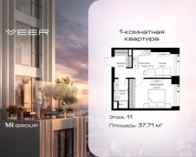 Продаётся 1-комнатная квартира общей площадью 37.71 м² без отделки в ЖК VEER на 11-м этаже 70 этажного дома.