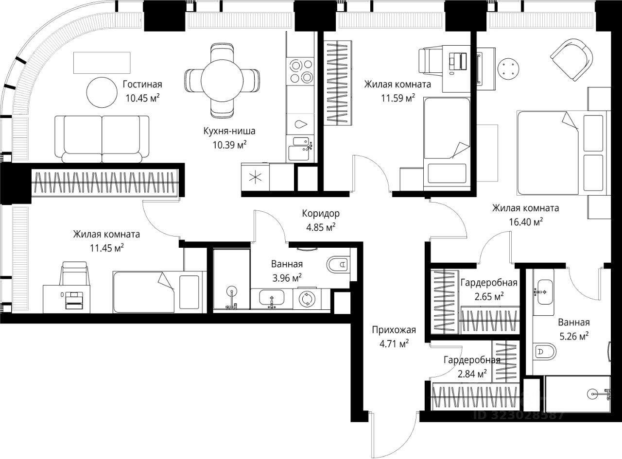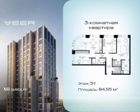 Продаётся 3-комнатная квартира общей площадью 84.55 м² без отделки в ЖК VEER на 51-м этаже 70 этажного дома.