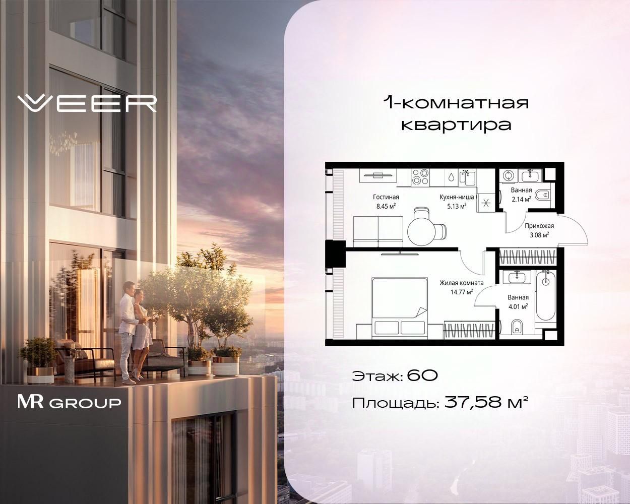Продаётся 1-комнатная квартира общей площадью 37.58 м² без отделки в ЖК VEER на 60-м этаже 70 этажного дома.