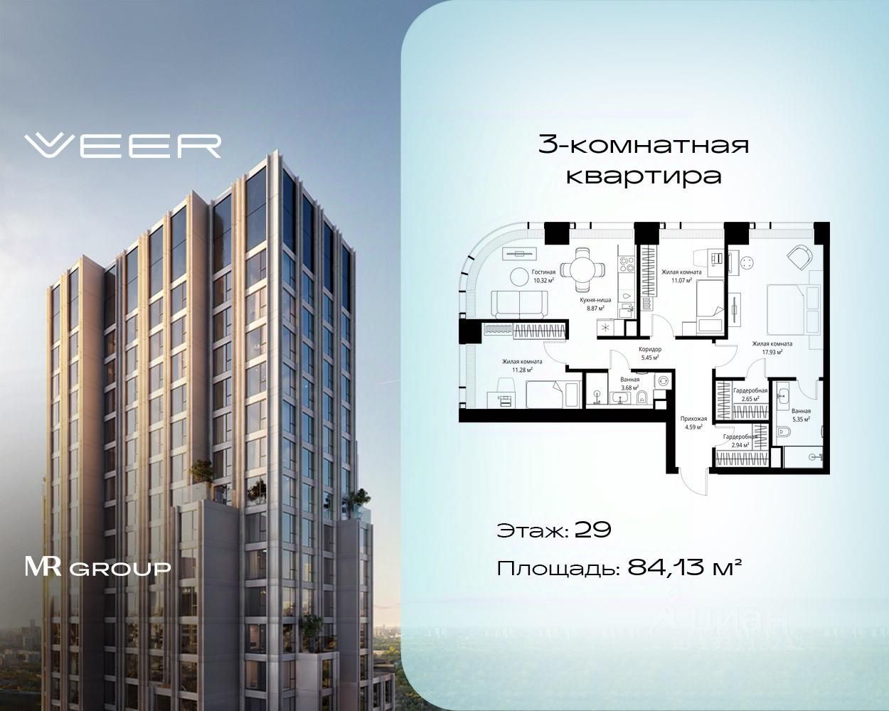 Продаётся 3-комнатная квартира общей площадью 84.13 м² без отделки в ЖК VEER на 29-м этаже 70 этажного дома.