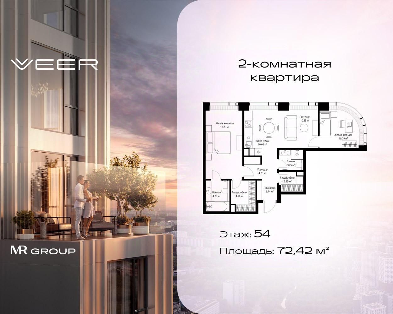 Продаётся 2-комнатная квартира общей площадью 72.42 м² без отделки в ЖК VEER на 54-м этаже 70 этажного дома.