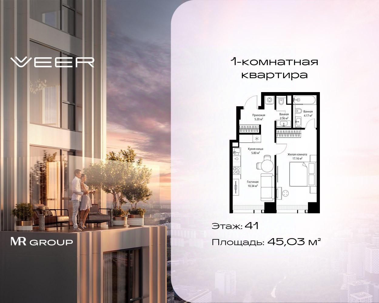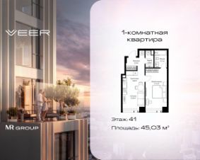 Продаётся 1-комнатная квартира общей площадью 45.03 м² без отделки в ЖК VEER на 41-м этаже 70 этажного дома.